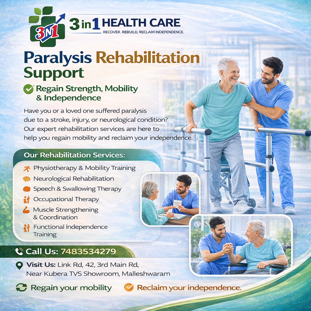 Paralysis Rehabilitation Support in Malleshwaram – Advanced Recovery Care at 3 in 1 Health Care Paralysis can significantly
