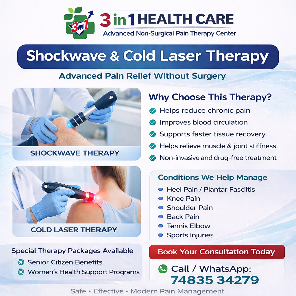 Chronic pain can affect your daily life, mobility, and overall well-being. Many people struggle with persistent joint pain, muscle stiffness, and inflammation that limit their ability to work, exercise, or even perform simple daily activities. At 3 in 1 Health Care – Advanced Non-Surgical Pain Therapy Center, we offer Shockwave Therapy and Cold Laser Therapy in Malleshwaram, Bangalore as modern, safe, and effective solutions for long-term pain relief without surgery.
